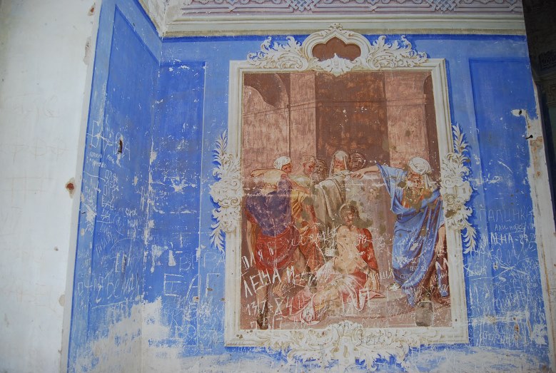 Потолки были проблемным местом здания еще до революции - их несколько раз чинили, в результате чего росписи церкви очень поздние. Тем не менее, здесь работал художник, который смог, используя гравюры Ю. Шнорр фон Карольсфельда и Г. Доре, создать хороший ансамбль монументальной живописи, один из самых впечатляющих в окрестностях Весьегонска, впечатляющий еще и тем, что живопись держится практически под открытым небом.