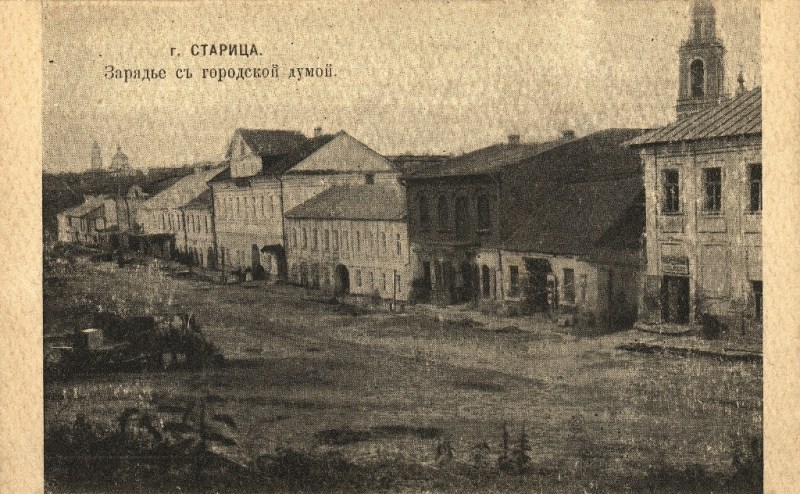 Вытянутые в "фасаду" дома имеют огромное градостроительное значение. К сожалению, плохая иконография Старицы вообще не позволяет нам в полной мере оценить его, когда эти здания были еще в порядке. Чуть лучше обстоит дело со стоящей на площади церковью Николы или Преображения. Фото с презентации "Прогулки по улицам Старицы с Александром Шитковым"