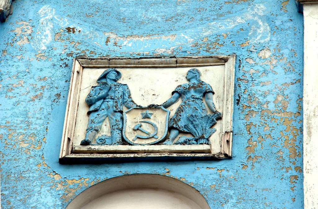 Проект дворца, видимо, предполагал разные варианты лепного декора, сообразно месту, где дворец строился. В Нелидове, шахтерском городе, лепные композиции напоминают о труде его жителей (фото Натальи Капраловой):